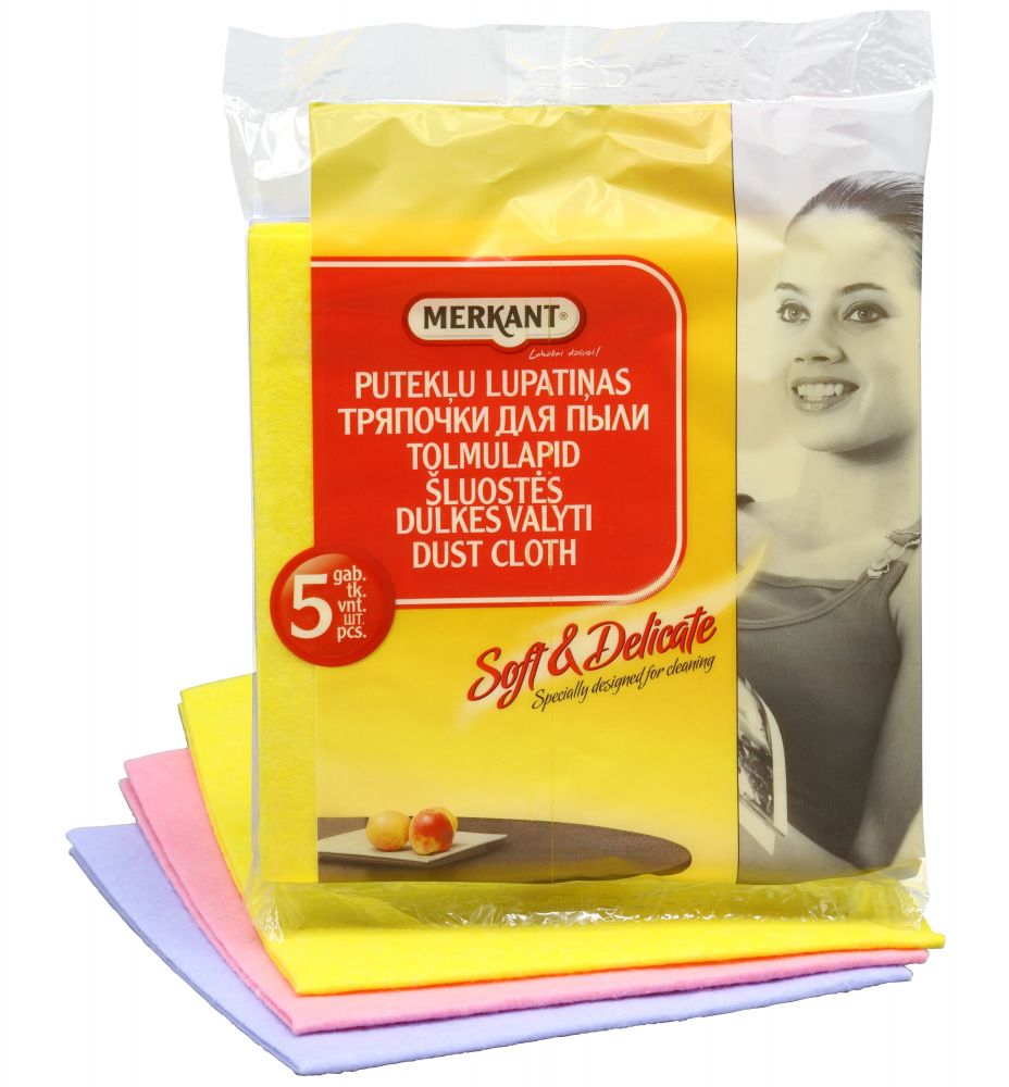 Putekļu lupatiņas. Ideāls palīgs mājsaimniecībā. Putekļu lupatiņām piemīt labas mitruma uzsūkšanas un putekļu savākšanas īpašības. Izgatavotas no 70% viskozas un 30% sintētisko šķiedru.